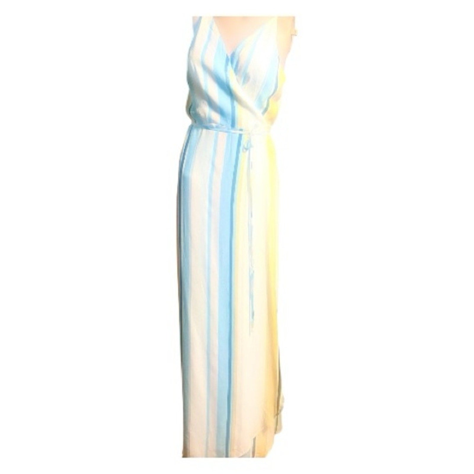 Chic maxi dress with vibrant stripes. Features a flattering wrap design. Sold at Anthropologie- made by Yumi Kim, Rush Hour Maxi. Adjustable straps and Hard to measure because it can fit various sizes. It is a large & could fit a medium sized up to a size 12 maybe 14 fit to flowy skirt and the wrap around style. Total length of the dress 57”. The fit is stunning & the dress is flattering.