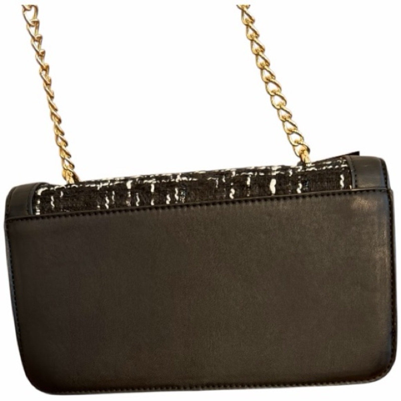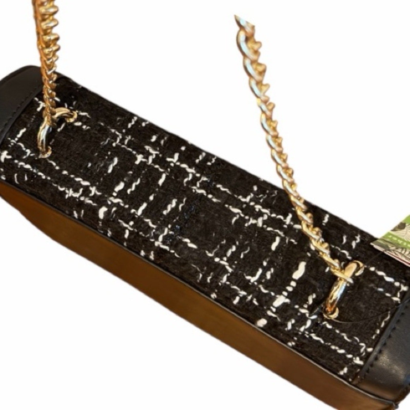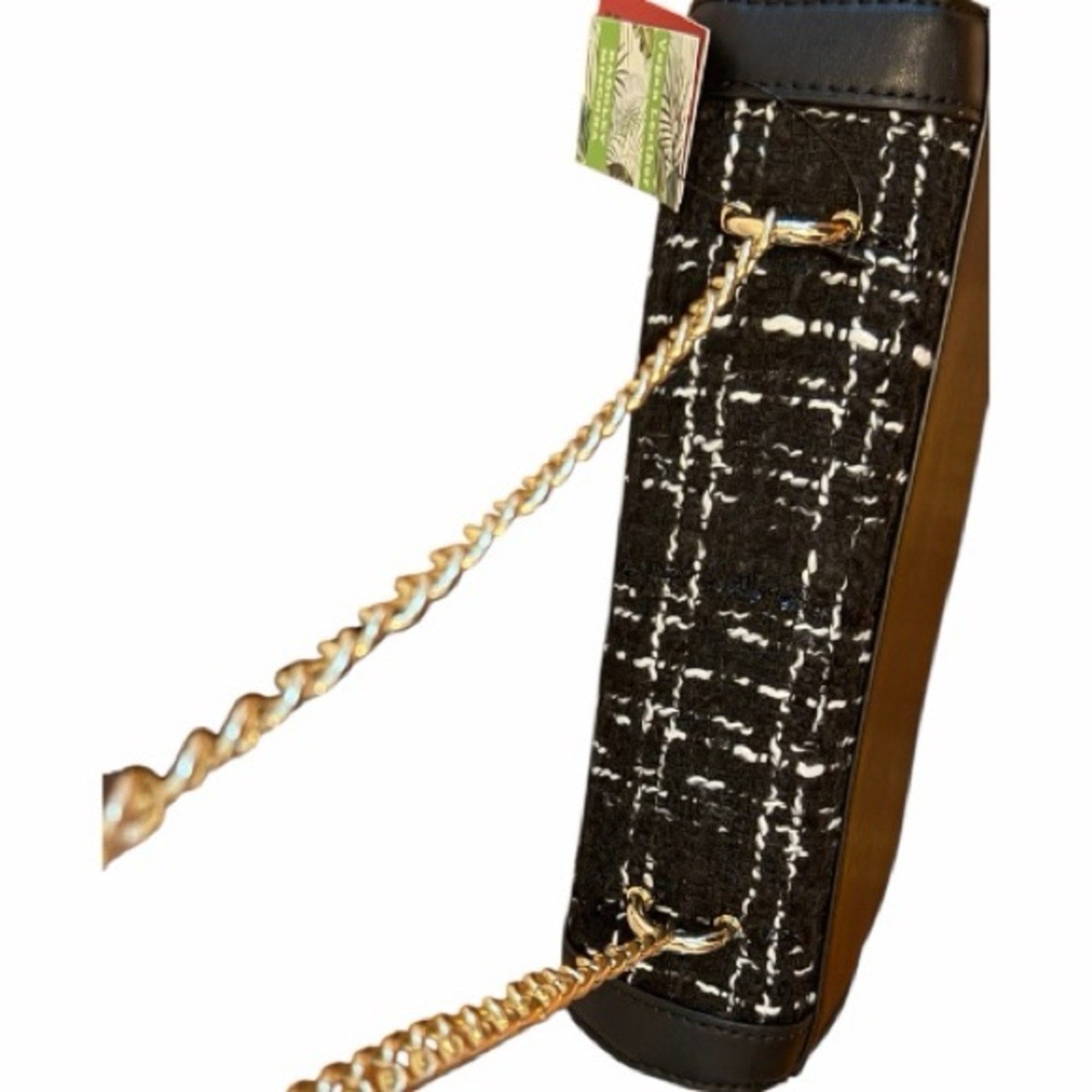 Features a luxe black-and-white tweed front, premium vegan leather body, and gold-tone hardware, strap is gold tone chain w/ vegan leather at top to allow for adjustment. The structured frame silhouette keeps its shape beautifully and gives the bag an elevated, designer look.