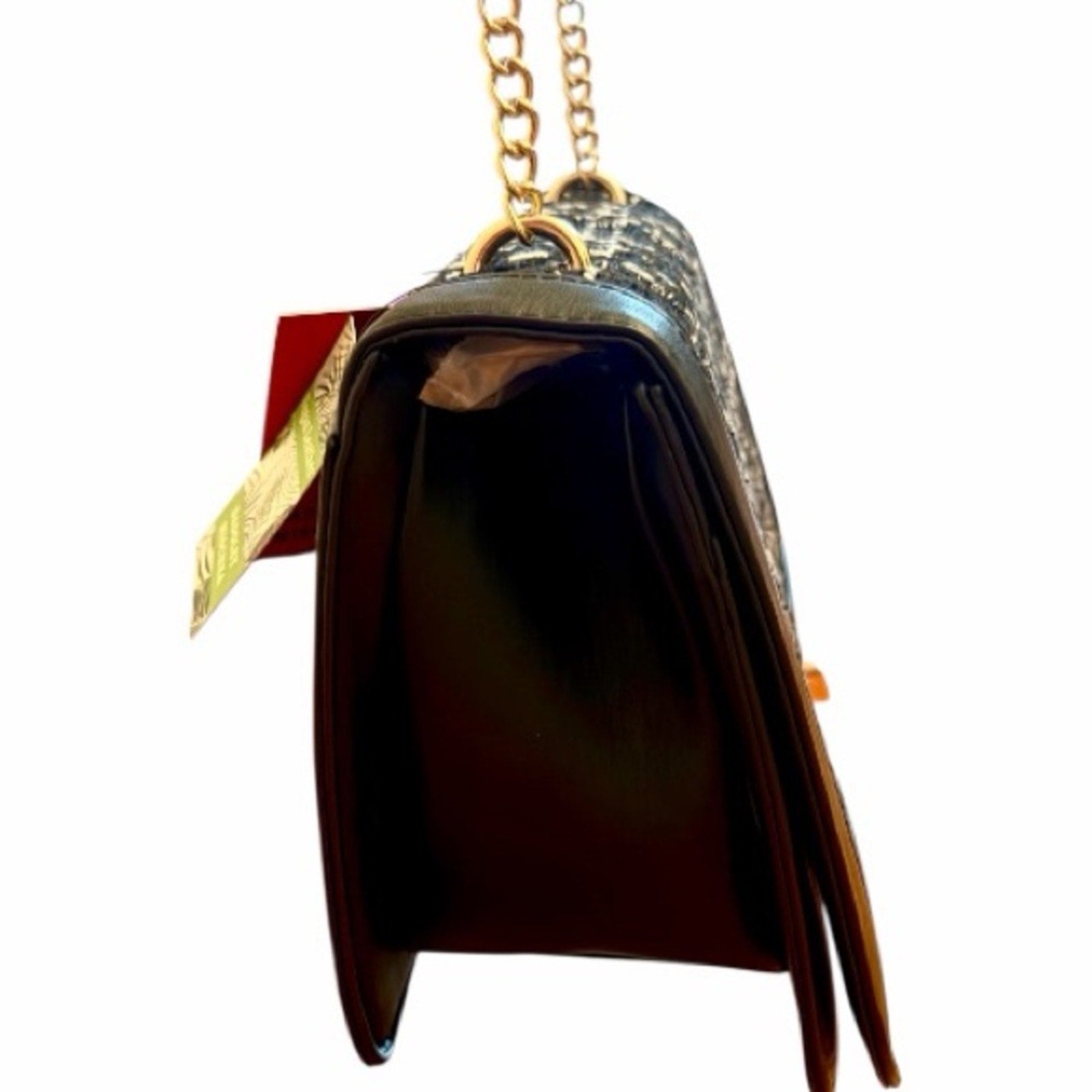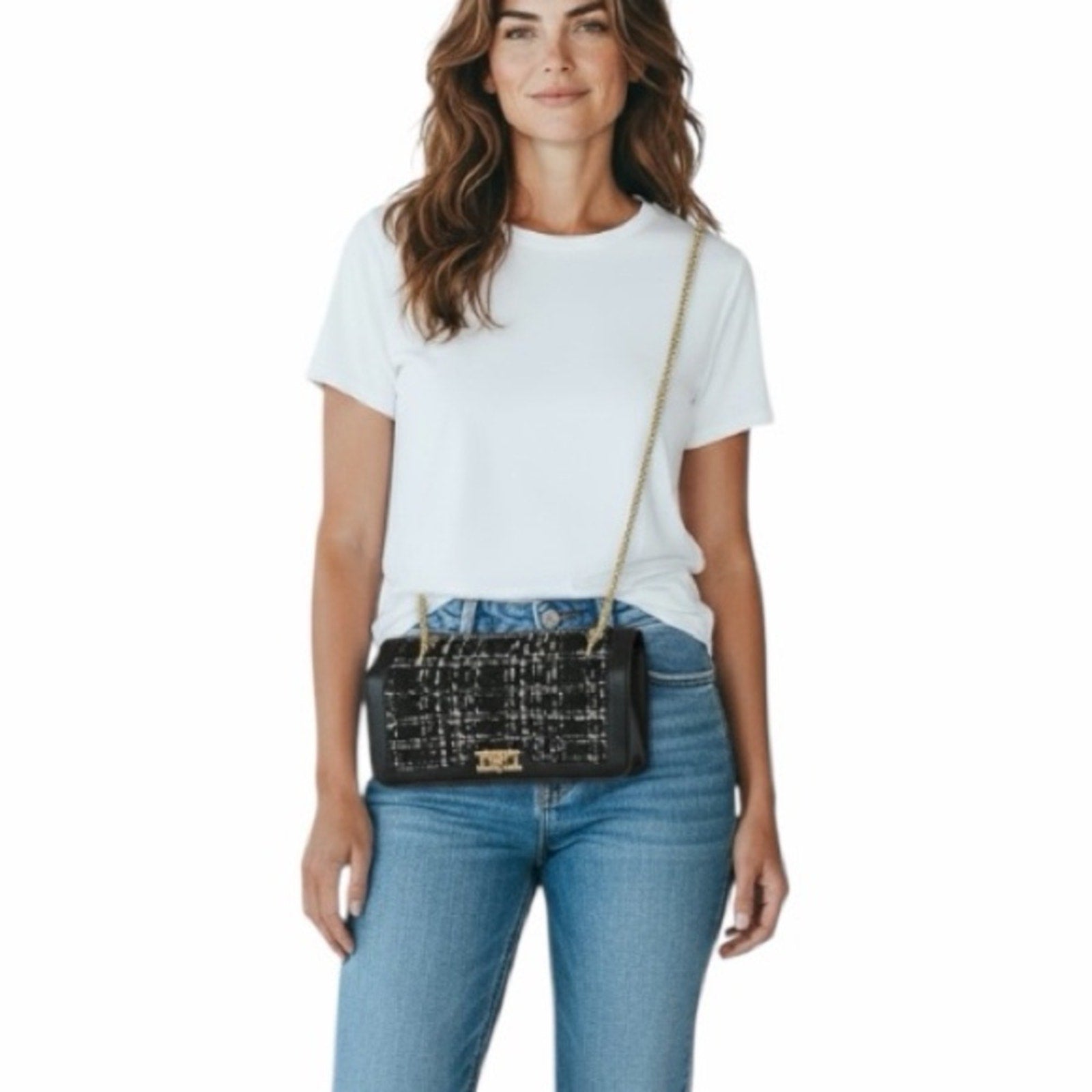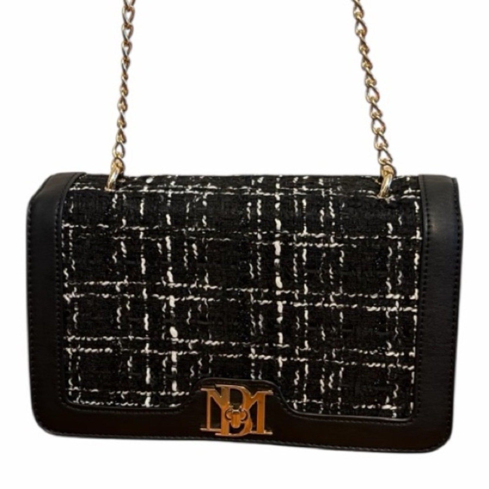 Features a luxe black-and-white tweed front, premium vegan leather body, and gold-tone hardware, strap is gold tone chain w/ vegan leather at top to allow for adjustment. The structured frame silhouette keeps its shape beautifully and gives the bag an elevated, designer look.