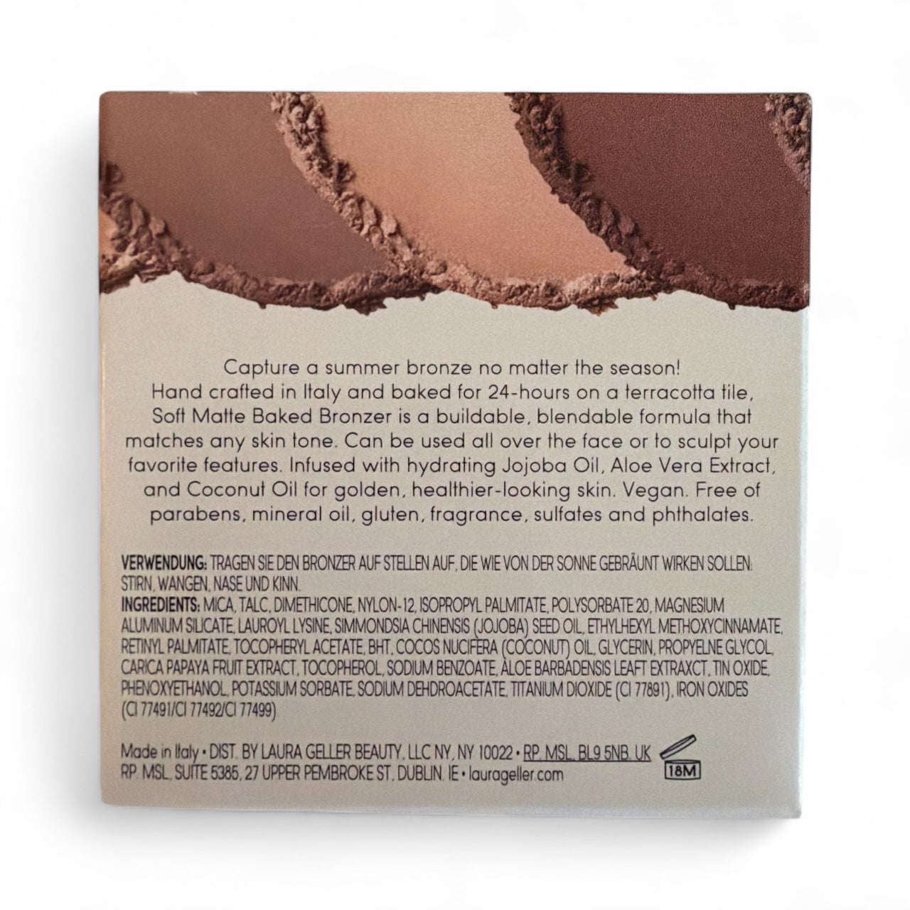 Hand crafted in Italy and baked for 24-hours on a terracotta file, Soft Matte Baked Bronzer is a buildable, blendable formula that matches any skin tone. Can be used all over the face or to sculpt your favorite features. Infused with hydrating Jojoba Oil, Aloe Vera Extract, and Coconut Oil for golden, healthier-looking skin. Vegan. Free of parabens, mineral oil, gluten, fragrance, sulfates and phthalates.