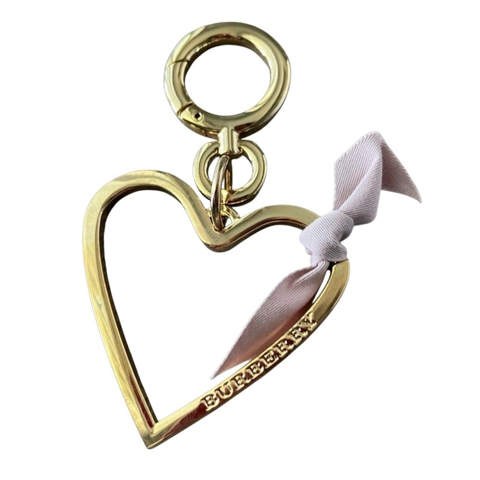 Elegant gold tone heart bag charm by Burberry. Can also be a key holder. Features a charming mauve ribbon accent.