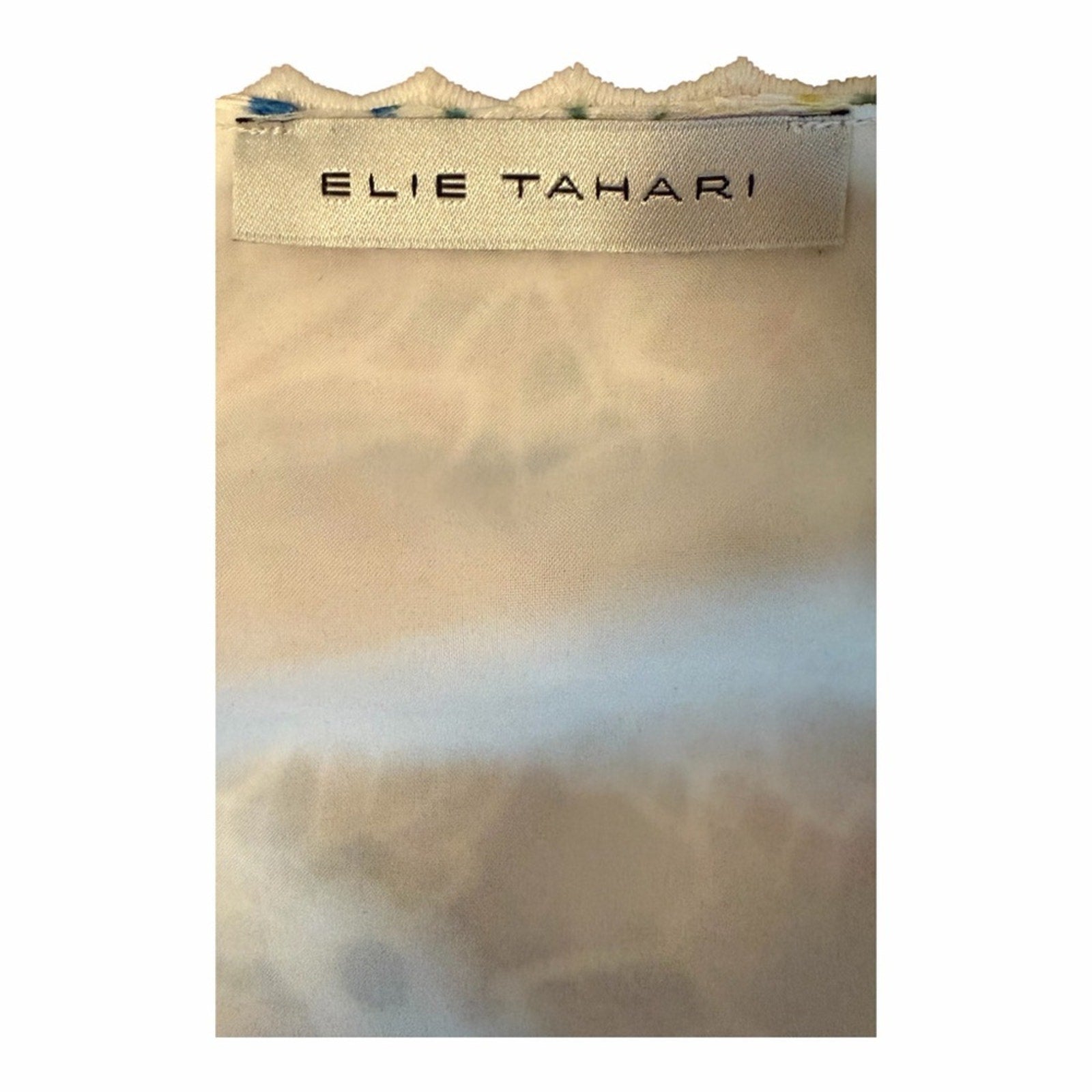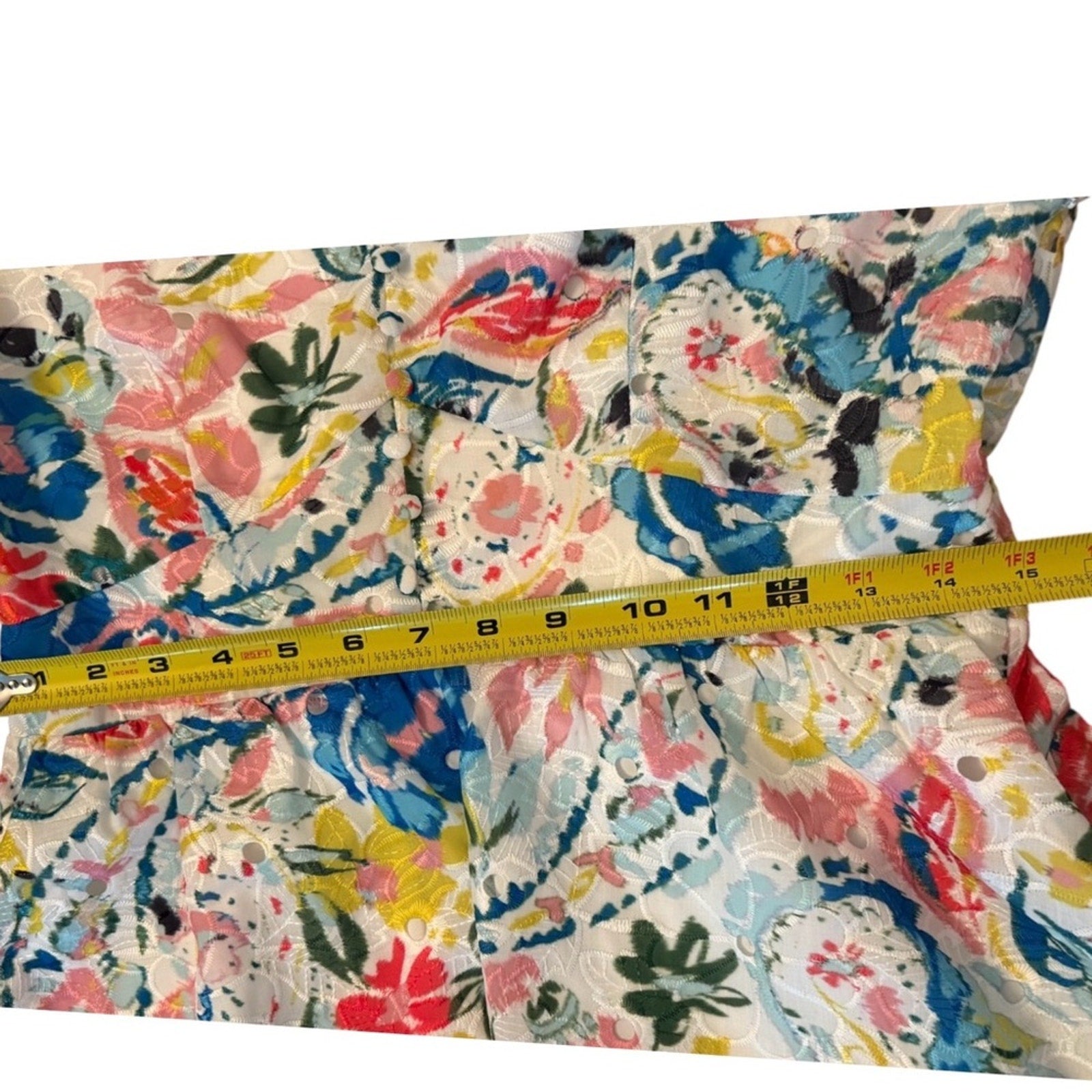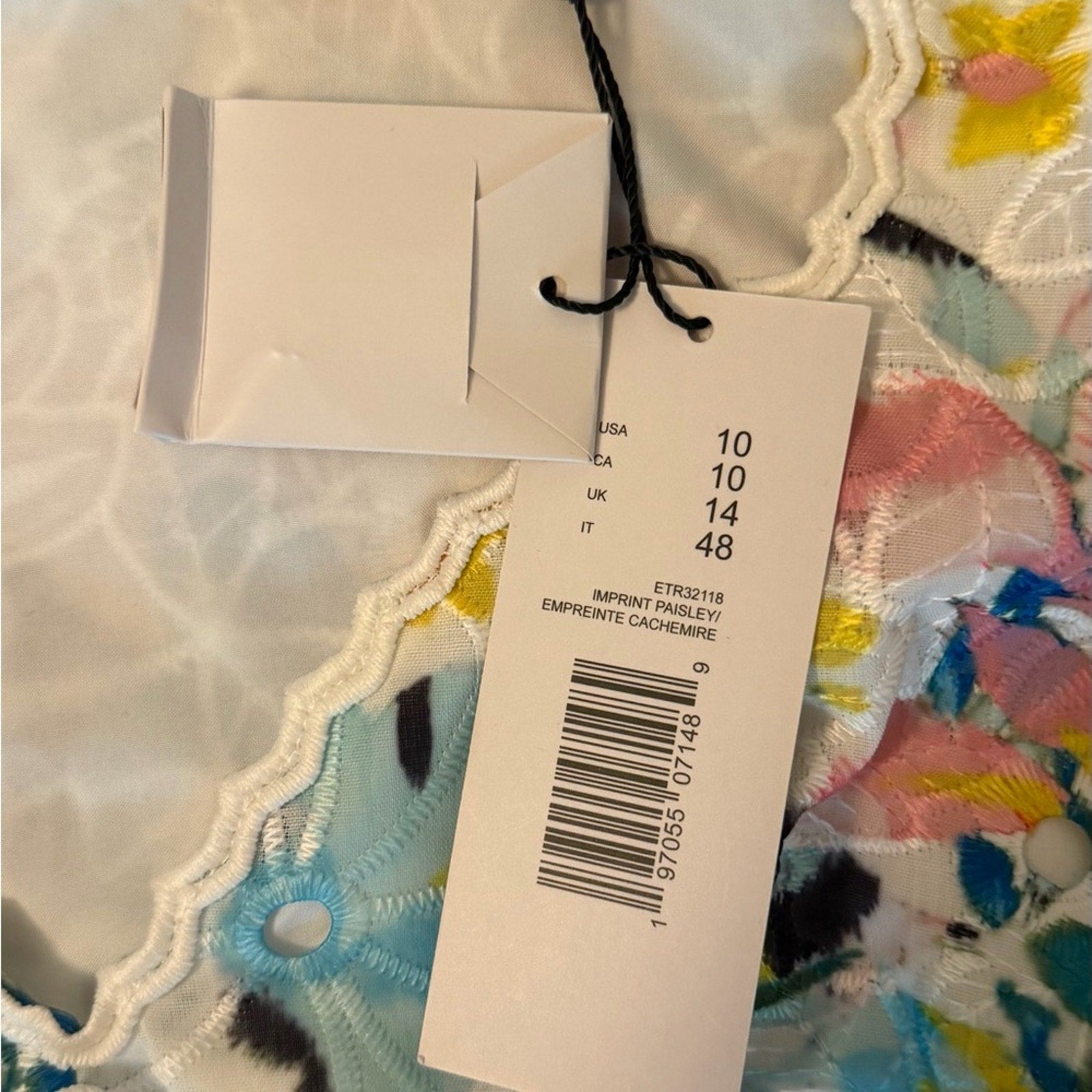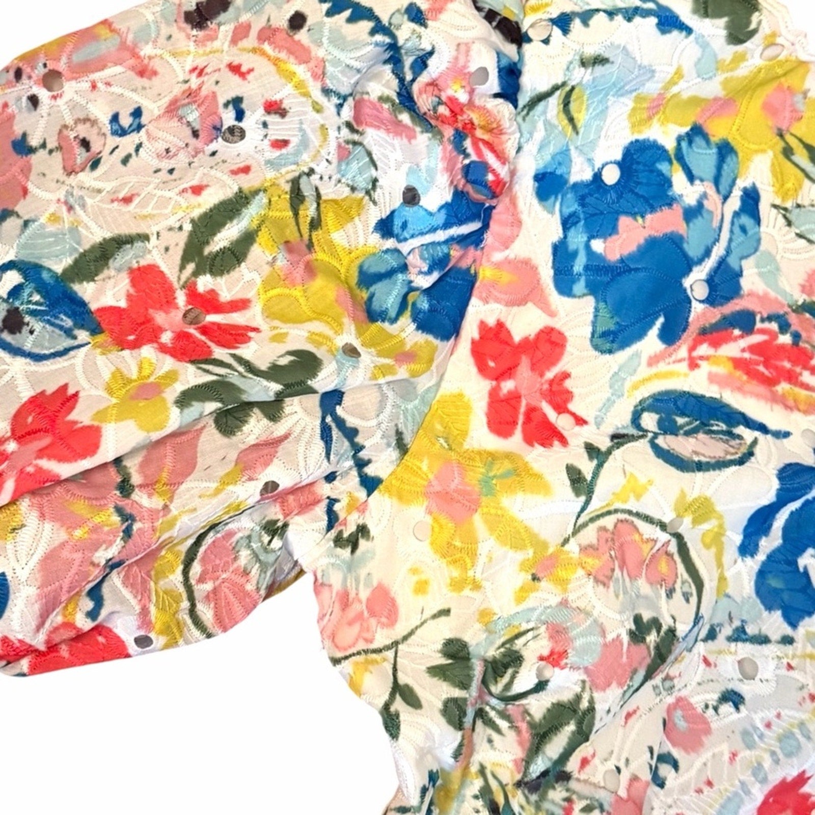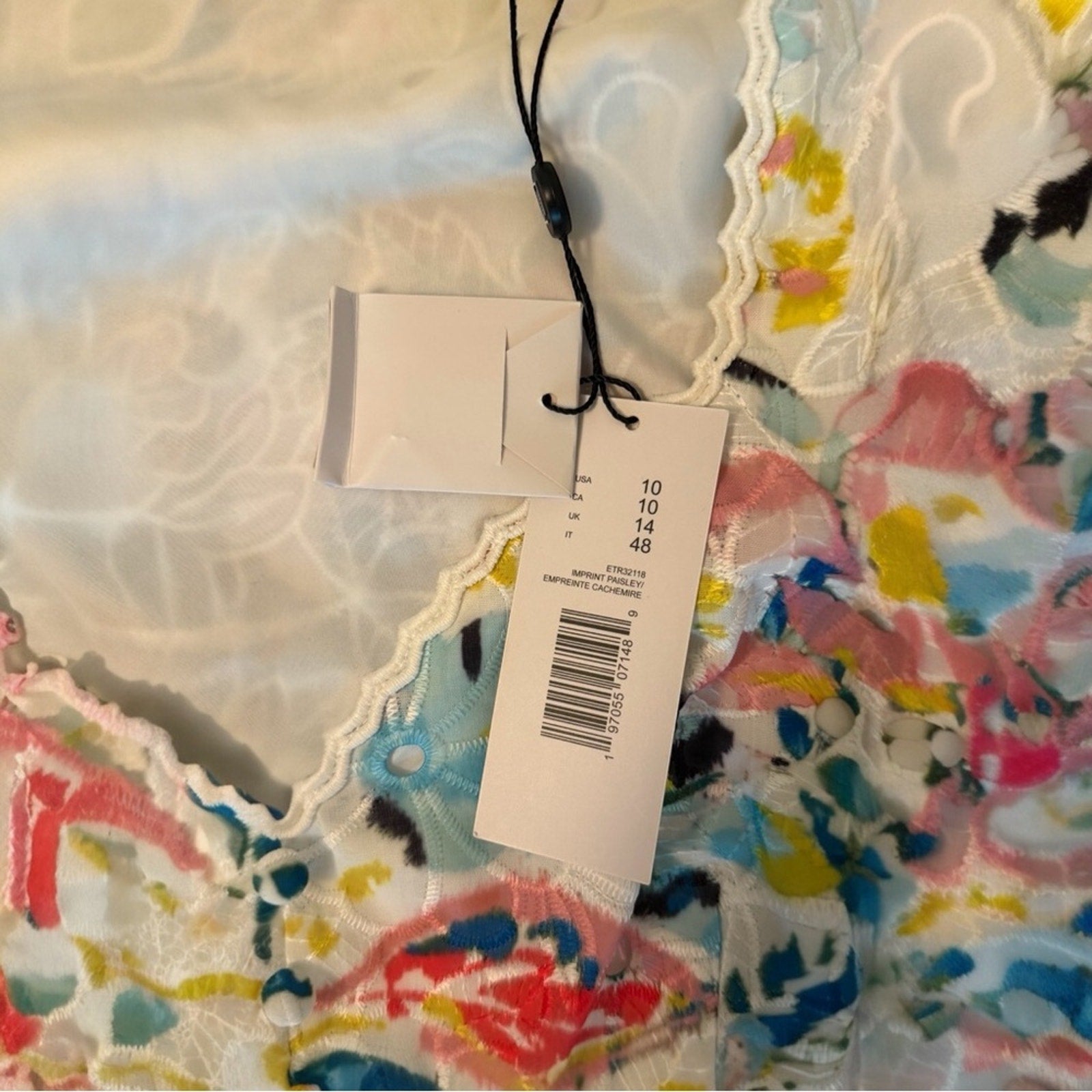 Beautiful Elie Tahari designer blouse featuring a vibrant floral paisley print with embroidered eyelet detailing throughout.
