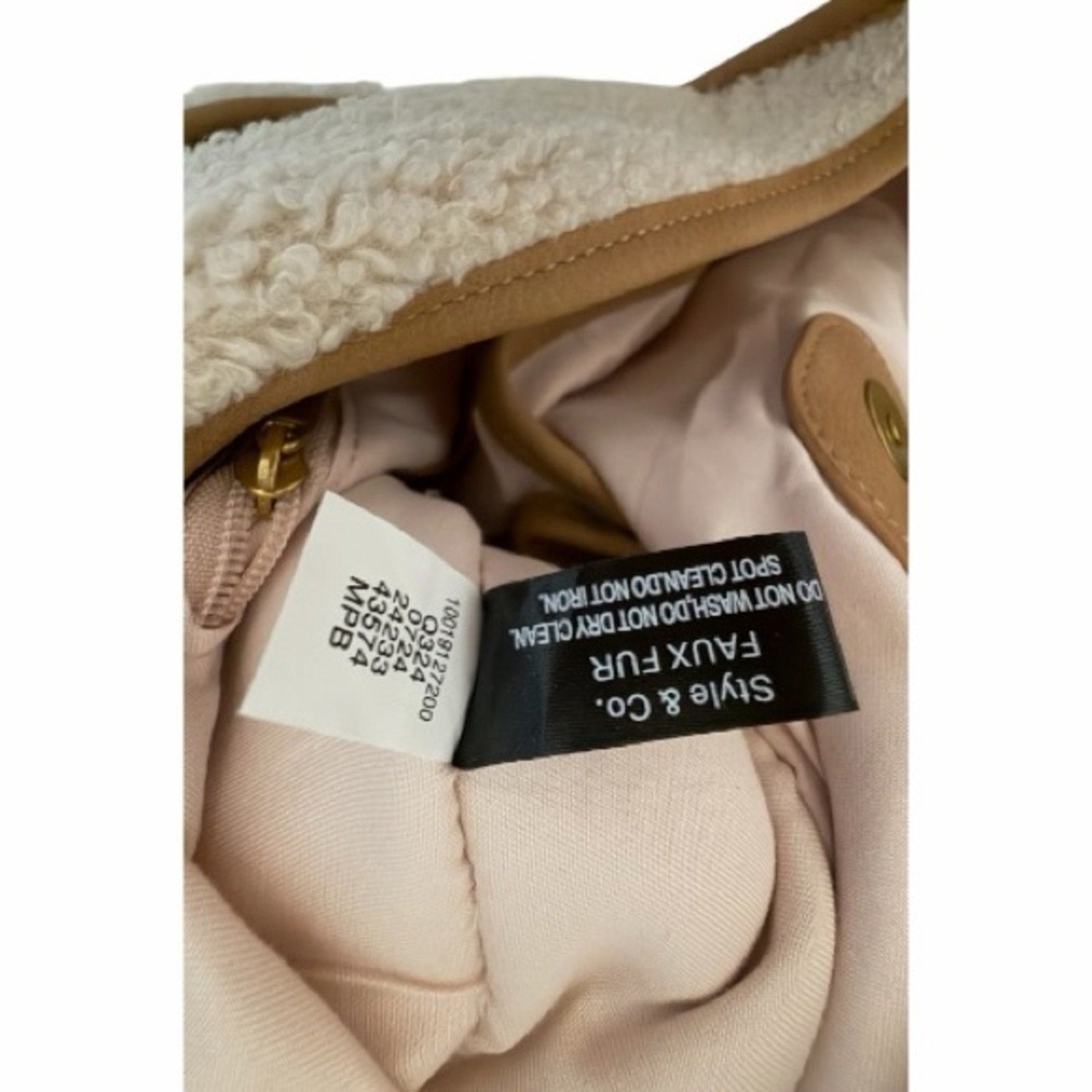 Cream sherpa (faux fur) exterior with tan vegan leather trim and two fully adjustable, removable straps so you can wear it multiple ways.