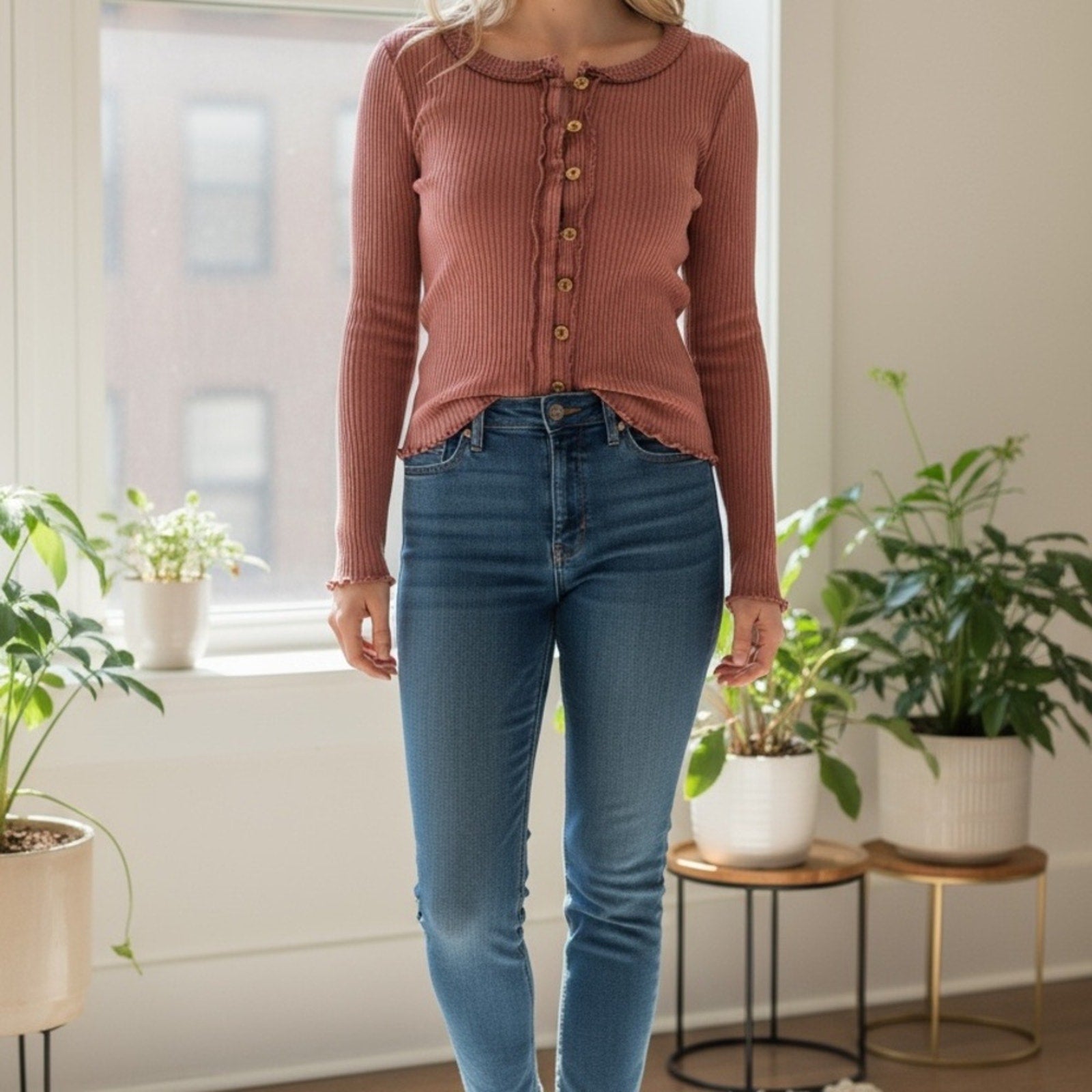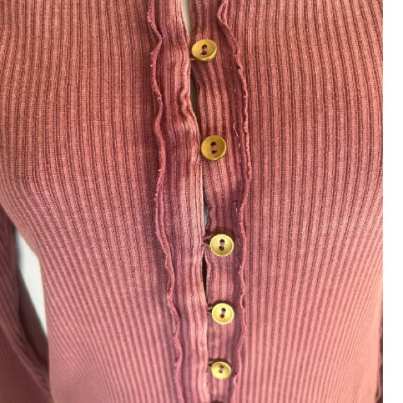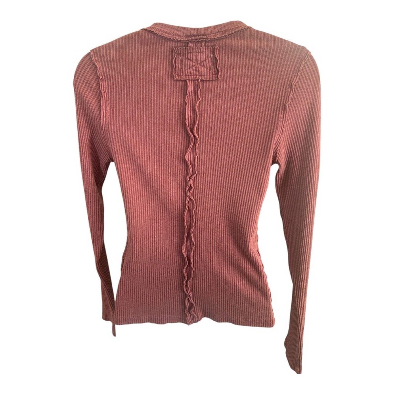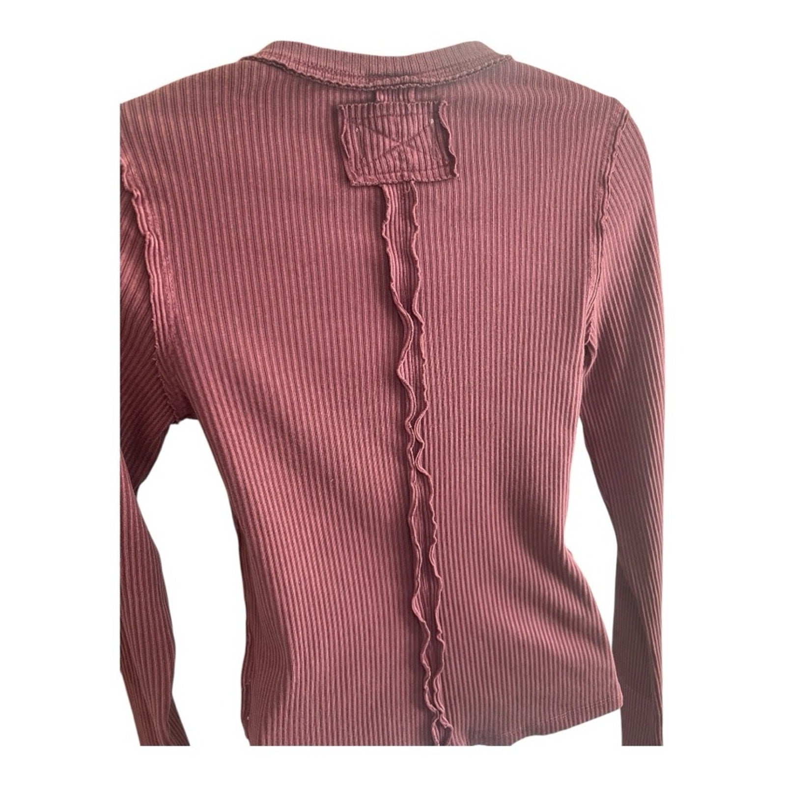 Free People - We -The - Free ribbed sweater in a mauve/ wine color. Very stretching with operational buttons so it could be unbuttoned as a cardigan. The buttons are Cooper’s color 11 and 2 extra in pouch. Long sleeve with extra detailing of ribbing at buttons, sleeve, sides and down middle of back. Please view pictures for description.