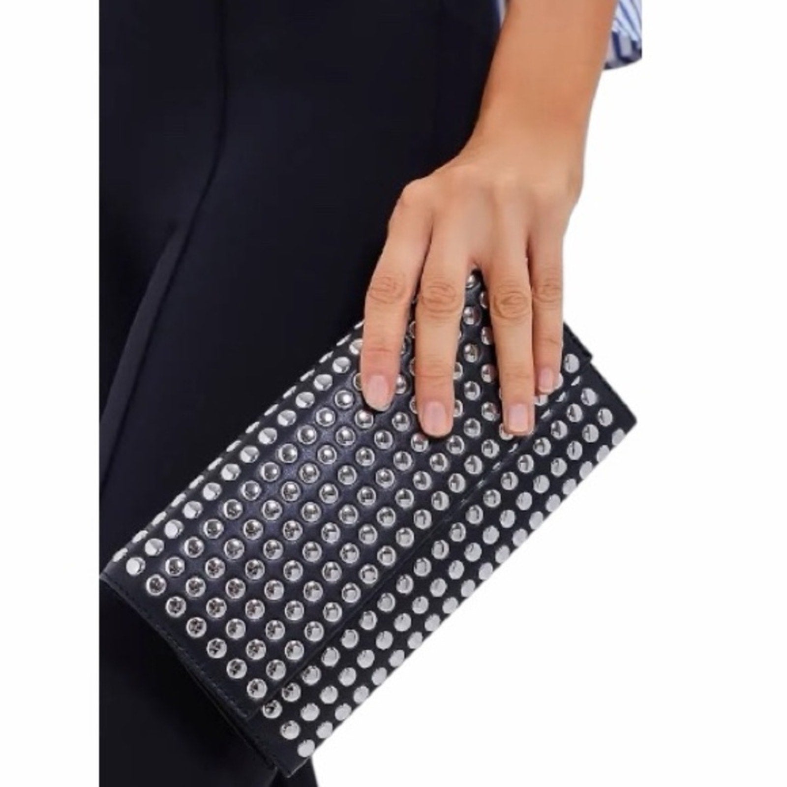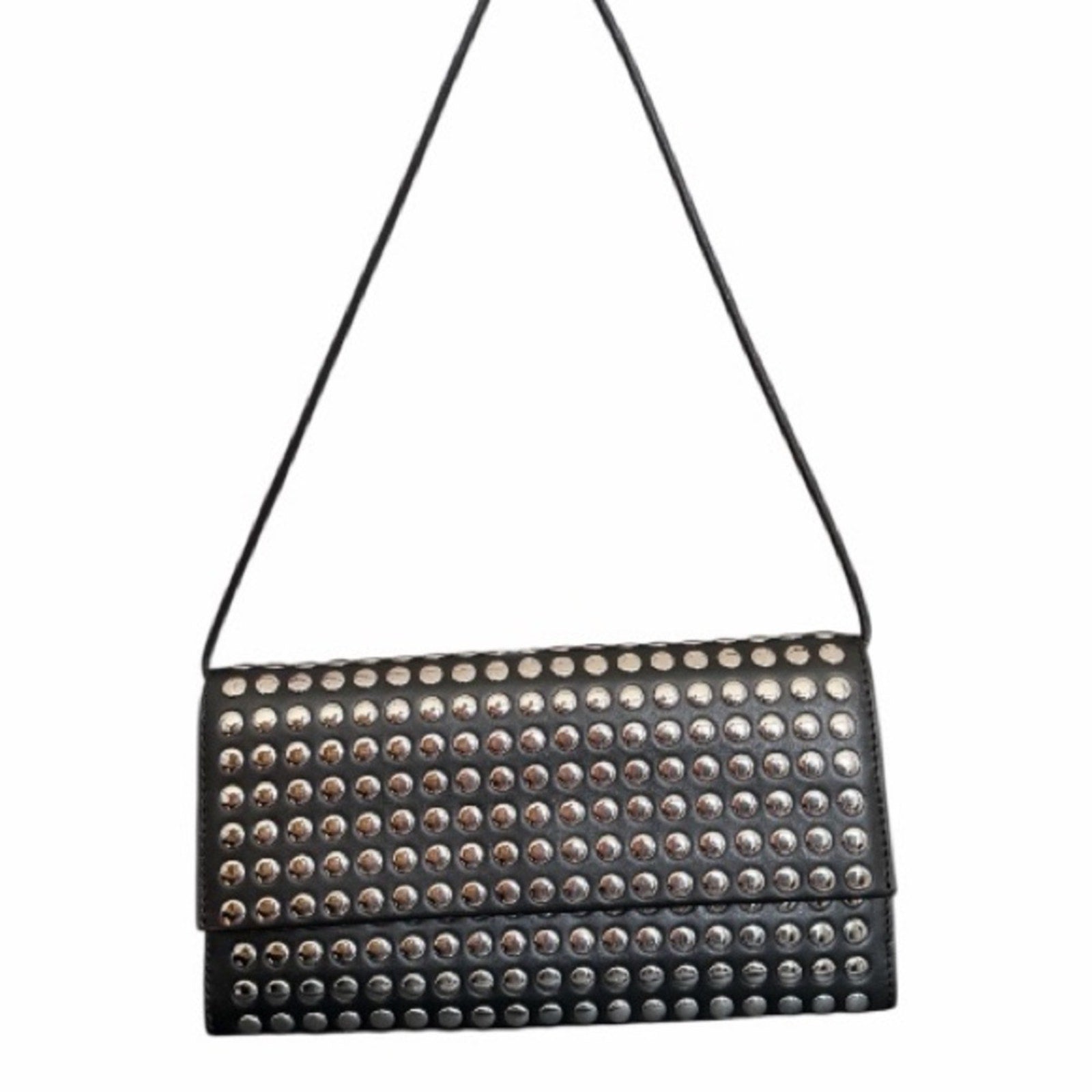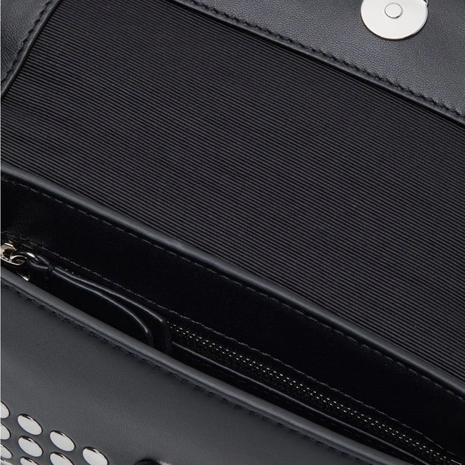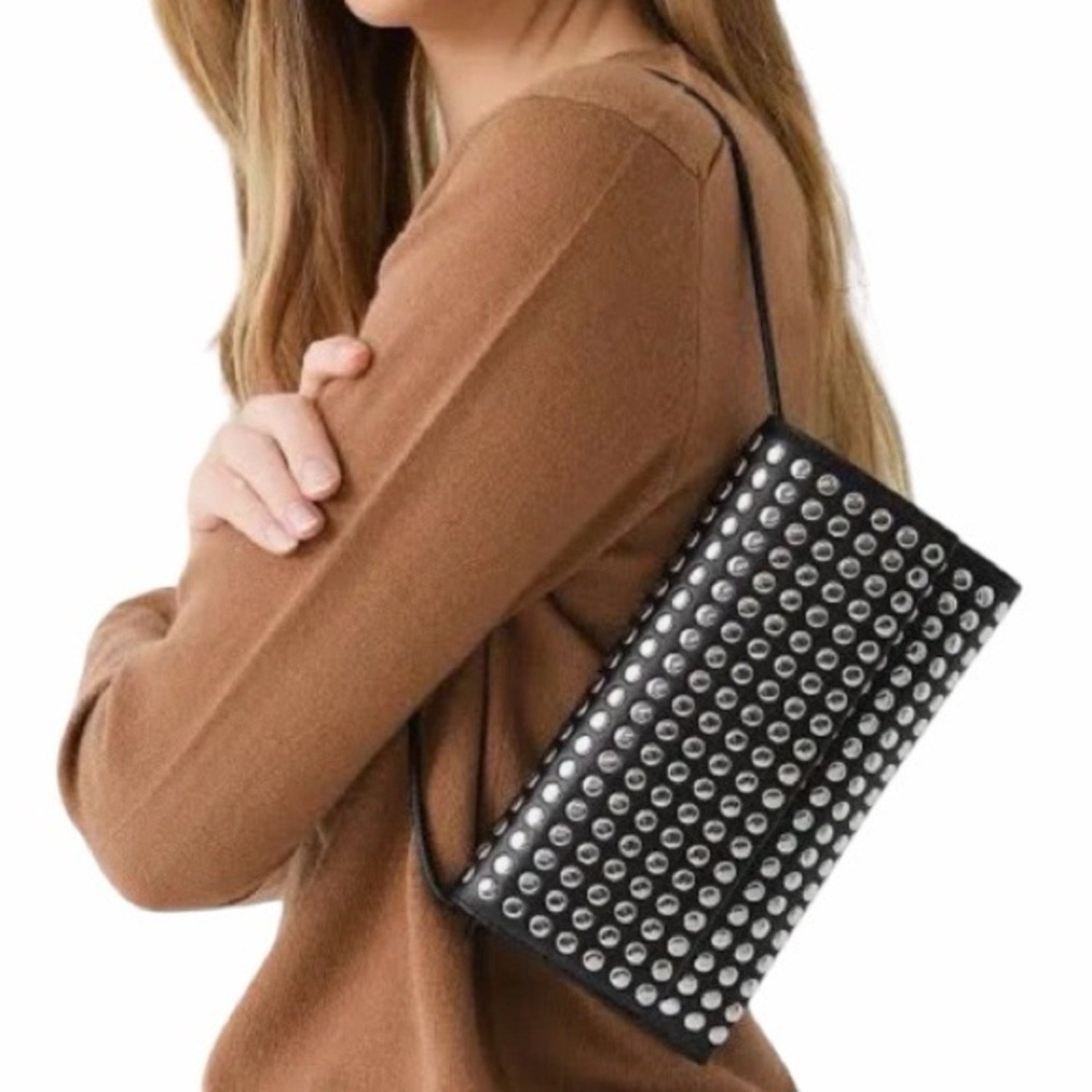The Loeffler Randall Charlee shoulder bag is crafted from studded leather. It features a rolled shoulder strap with an 8.5 inch drop. The bag can be worn as a clutch or shoulder bag. The flap top has a magnetic closure. The bag is lined with cotton and measures approximately 5 inches in height, 8.8 inches in width and 1 inch in depth. The shoulder bag has a flap open closure. The handle is detachable to all easy carry as a clutch or wallet.