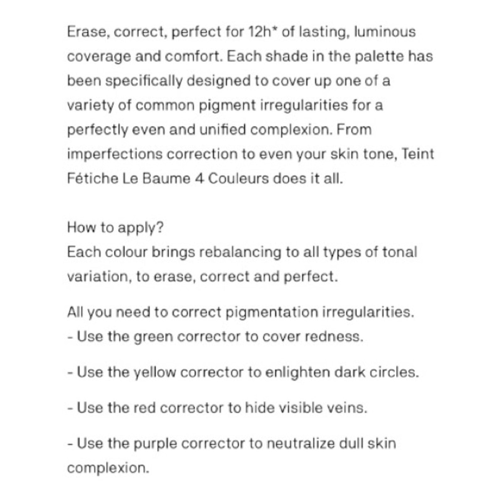 Fétiche Le Baume 4 Couleurs. The pigment rebalancing palette features 4 easily blendable shades to fix visible irregularities caused by redness, dark circles, visible veins, and dullness for all skin types and tones.