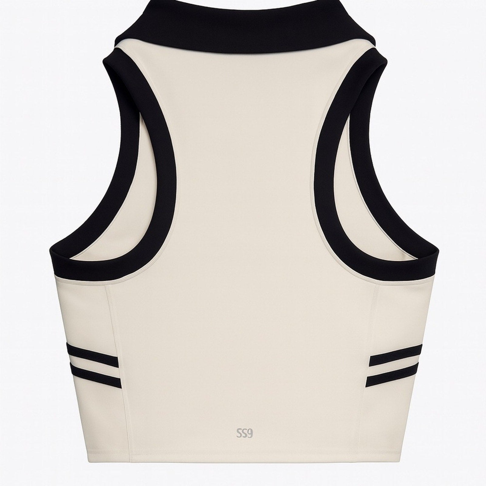 Sleeveless racerback cut with a built-in shelf bra (no padding). Smooth stretch fabric and flattering cropped fit — great for tennis, pickleball, golf, or athleisure.
