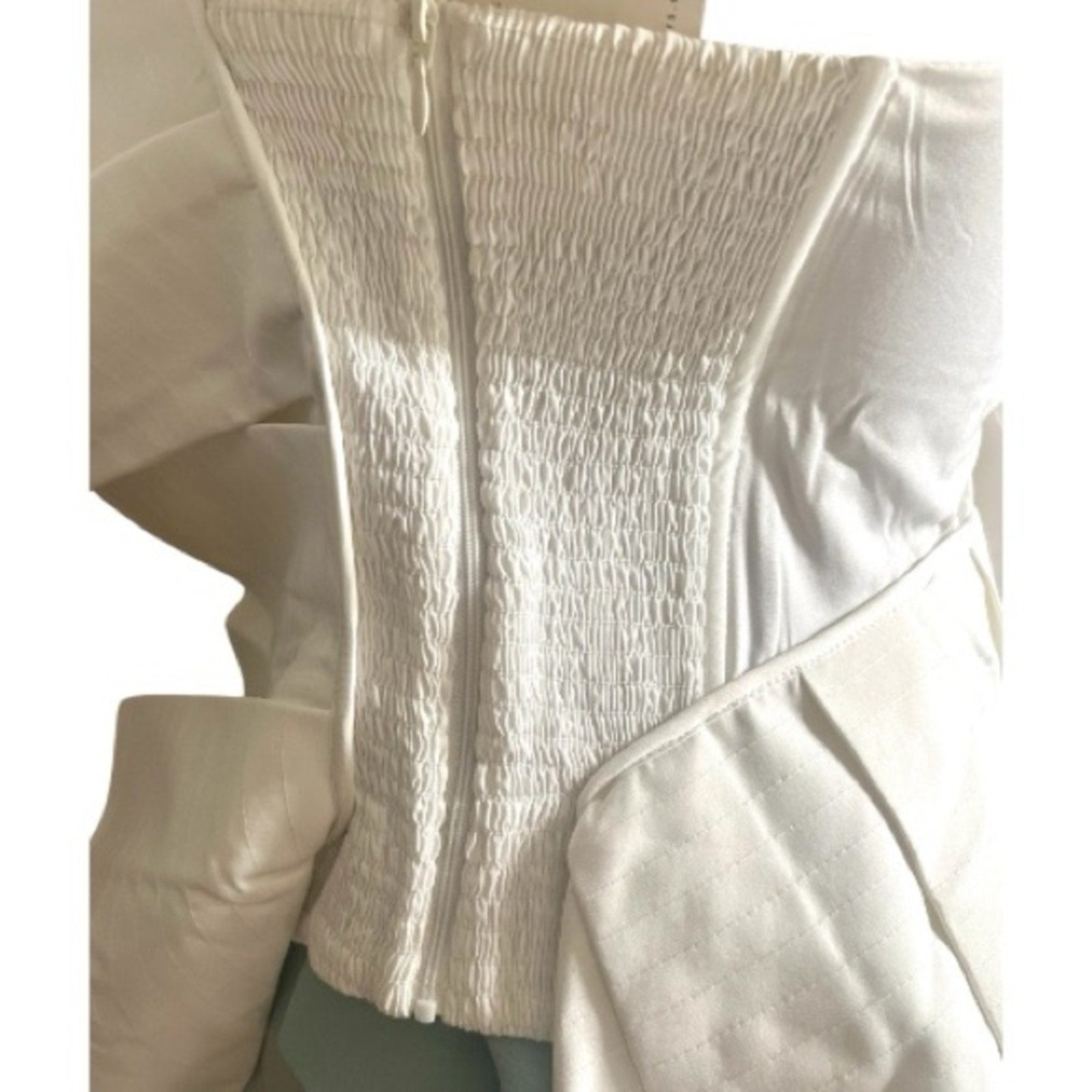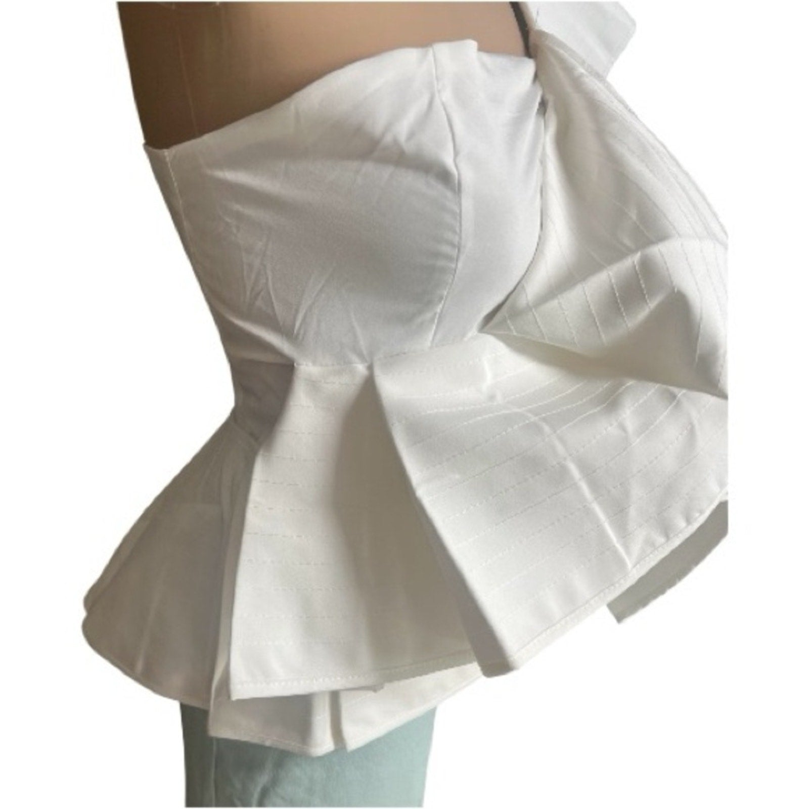Elegant white one-shoulder top with dramatic ruffles. Structural ruffles bring a dramatic shape to this one-shoulder STYLEKEEPERS top. Very fashionable and can be worn dramatic and or mire subdued depending on how you dramatic you want the ruffles. The ruffles can be flattened for a more demure look.