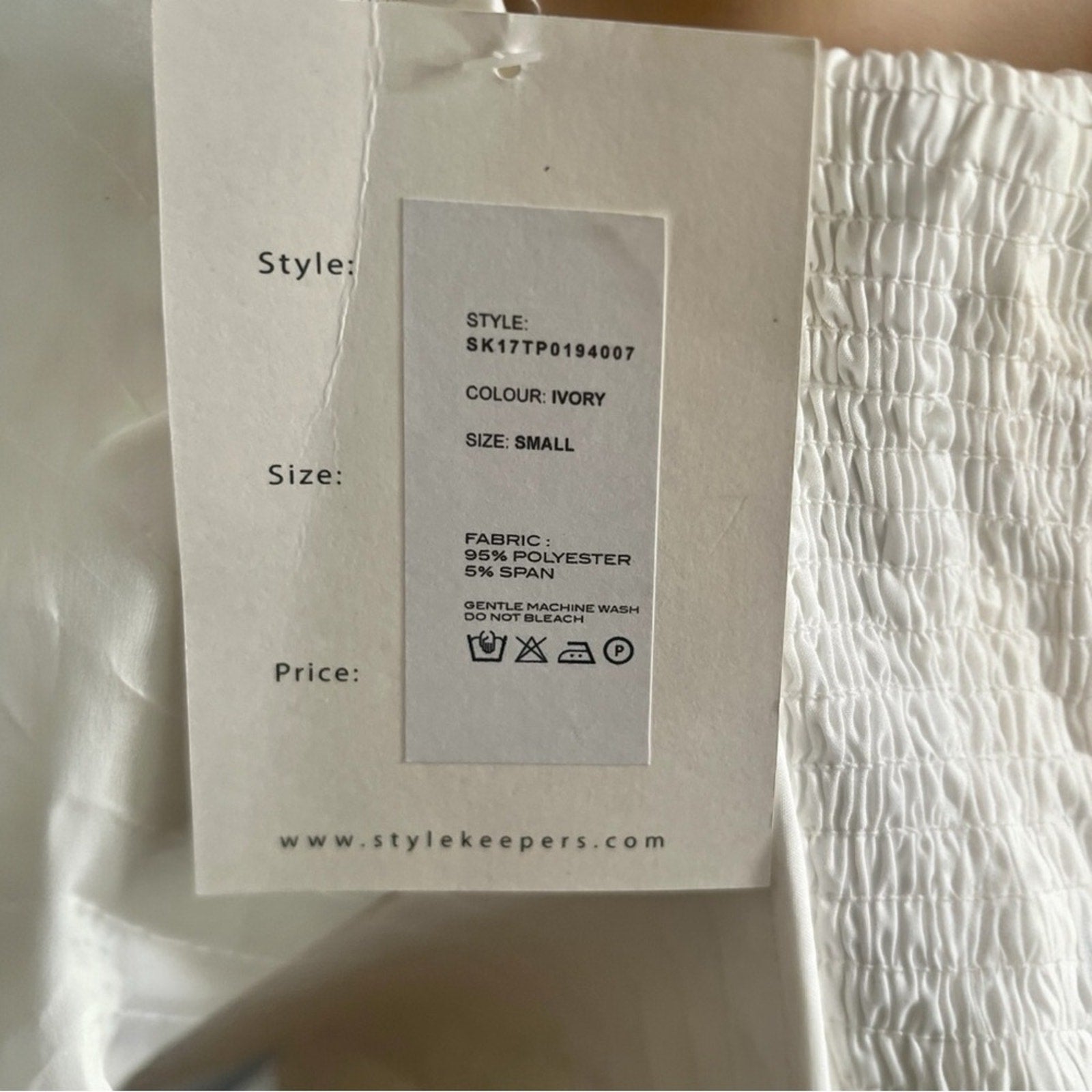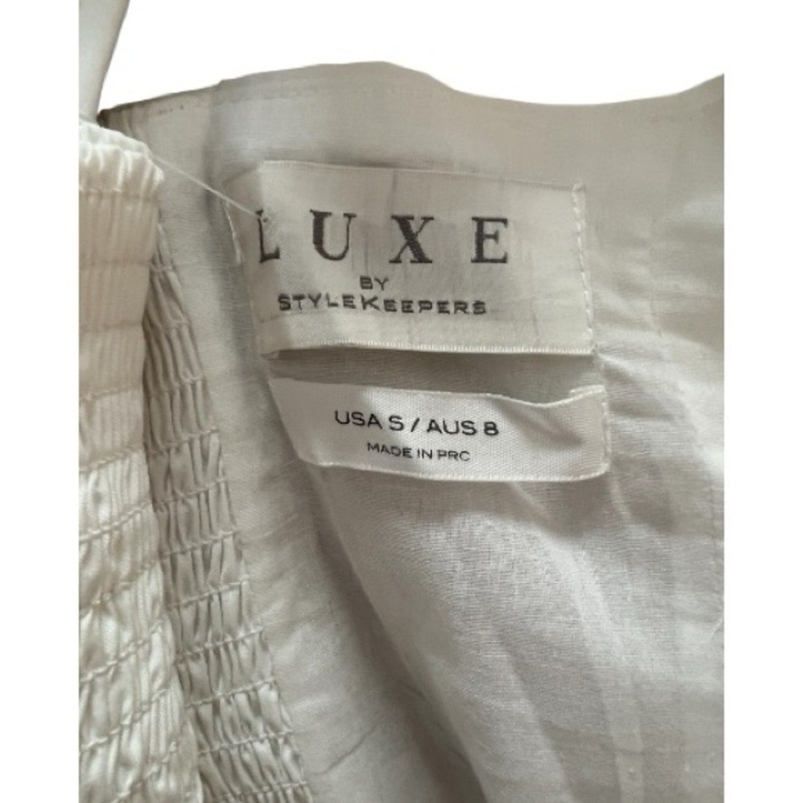 Smocked elastic and hidden zip in back.