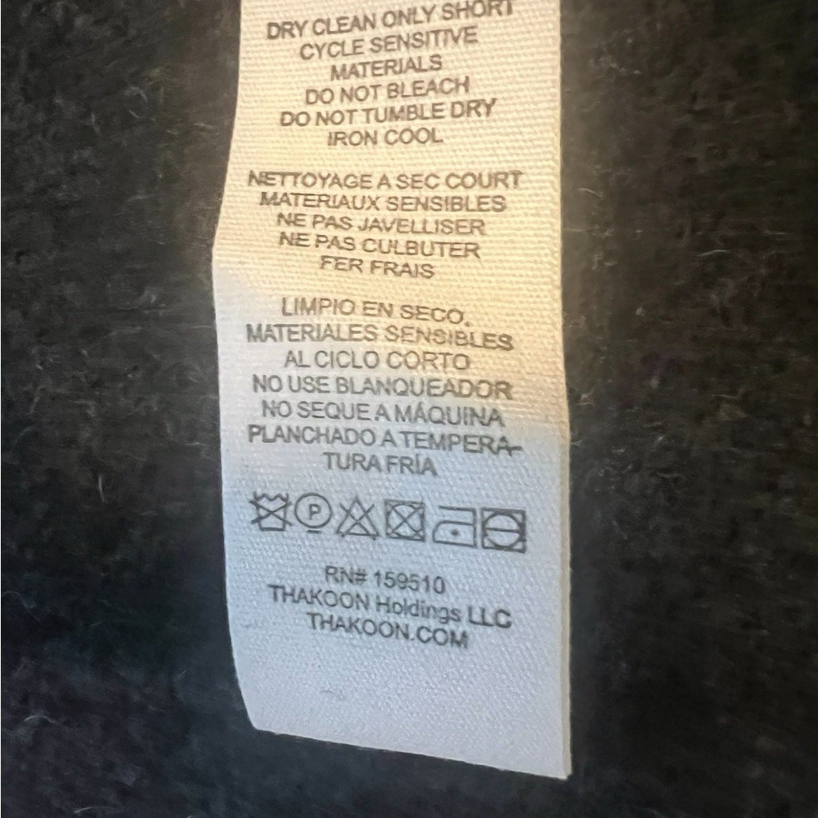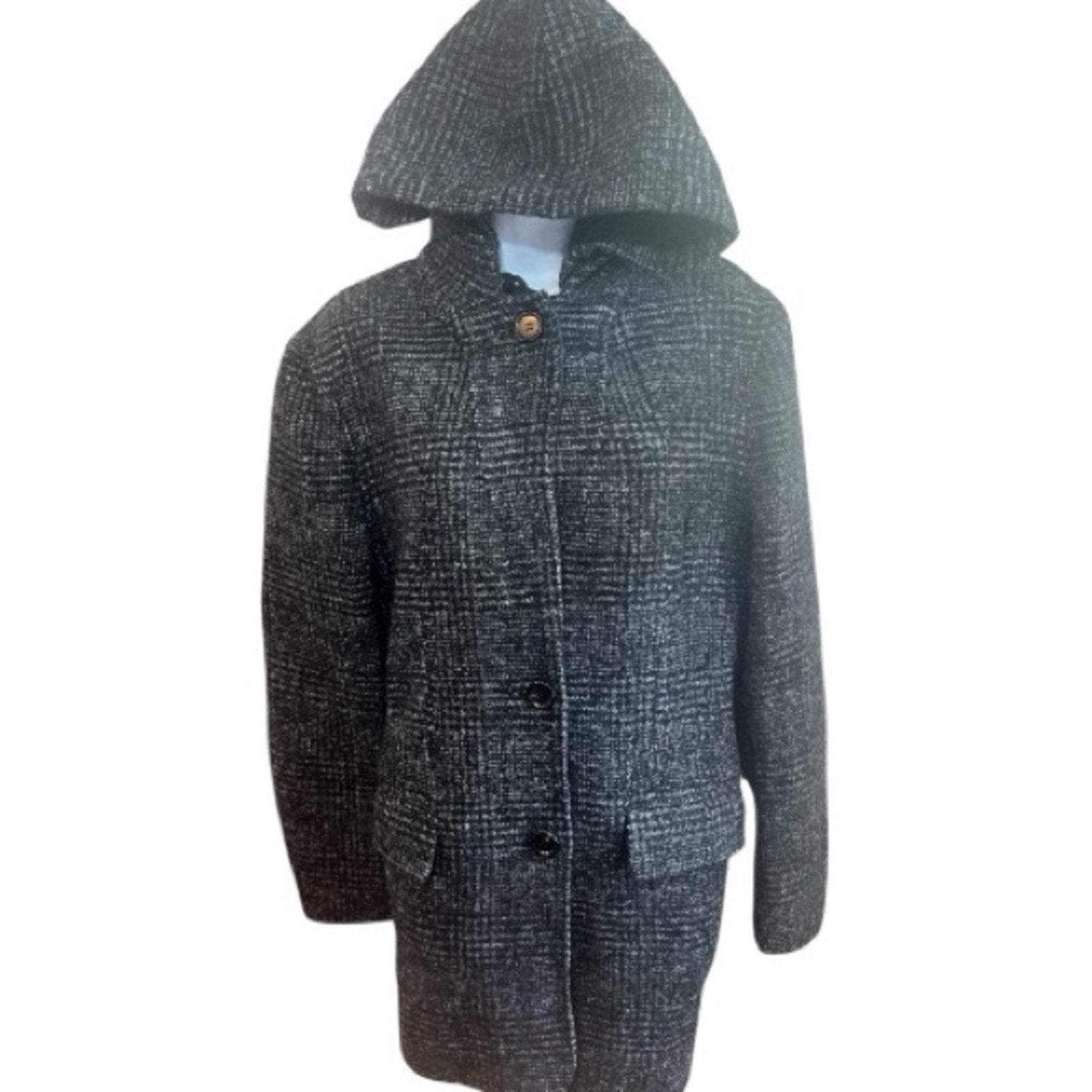 THAKOON WOOL BLEND TWEED HOODED COAT. Stylish new take on the blazer - style sport coat. Featuring a new twist of the hood. Button closure and two front flap pockets and a split collar make this a staple piece. The slit in the back of the coat is still sewn closed.