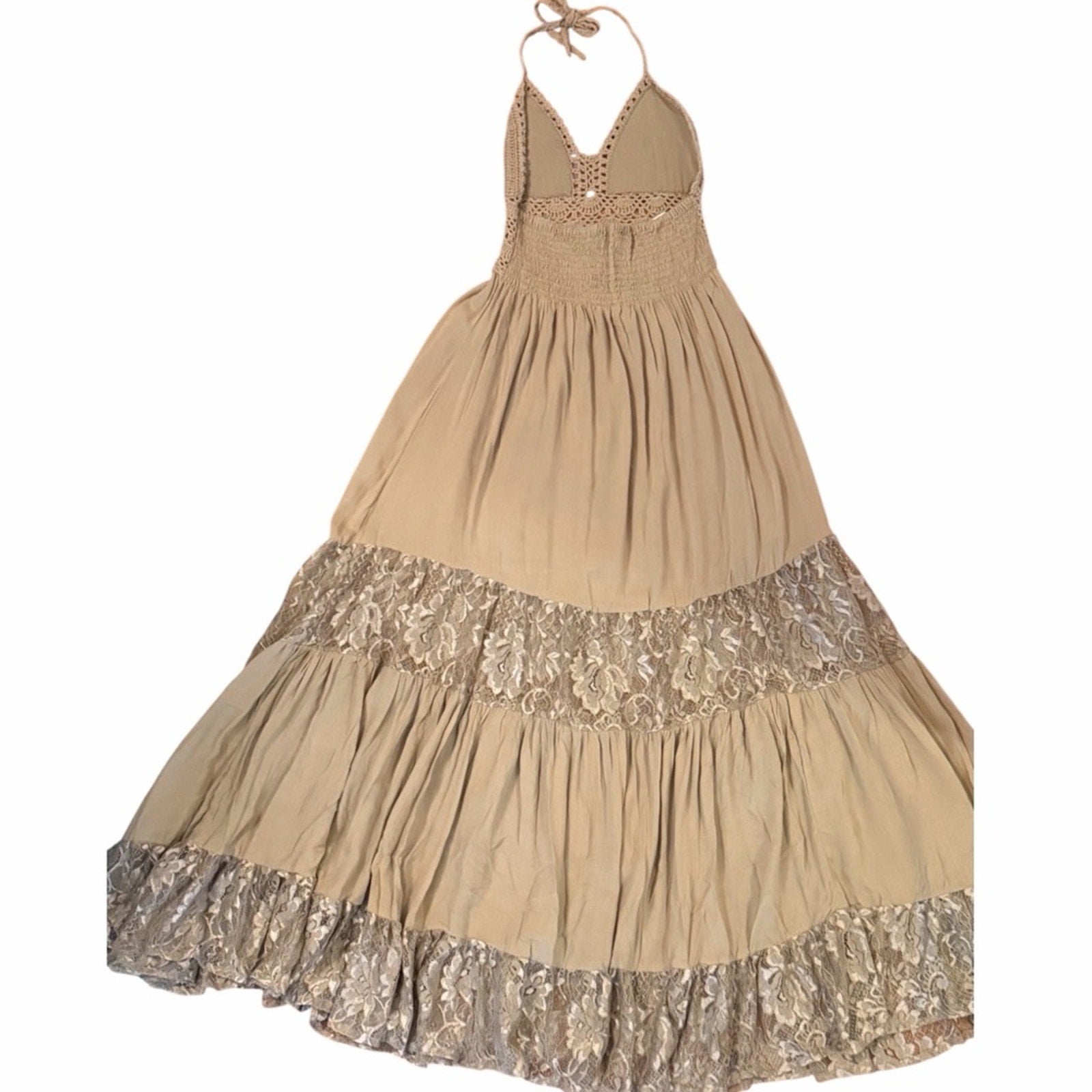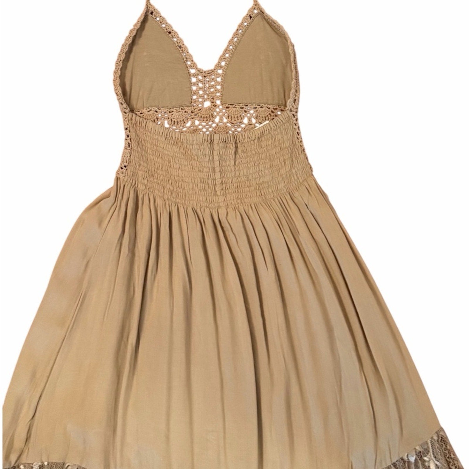 The smocked back and halter tie allow for a flexible fit, while the lightweight fabric drapes beautifully. The macrame top and lace detailing add a delicate artisan touch.